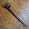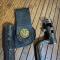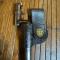 Douille à virole médiane. Colier de serrage avec vis fonctionnel. Dans son fourreau fer bronzé et gousset en cuir empiècement laiton MASS