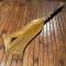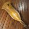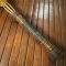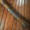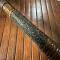 Manche en bois exotique à pommeau sphérique, habillé de peau serpent , enroulé à ses extrémités d'un large filigrane et de d'un filigrane tressé de cuivre , lame forgée à pans creux en cuivre rouge , perforée à trois reprises de lucarne souligné de ciselures et de belles gravures géométriques .
