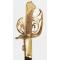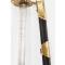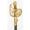 Rare sabre d'officier de marine de type petit Montmorency, forte garde en laiton finement ciselée et dorée, branche ornée de filets, plateau ajouré de rayons, coquille ajourée ornée au centre d'un navire dans un cercle avec à la poupe un coq dressé, l'ensemble surmonté d'un bonnet phrygien et, de part et d'autre, une ancre et des poulies, à la partie supérieure deux branches de roseaux, calotte à longue queue terminée par une tête de lion, fusée entièrement filigranée. Forte lame légèrement courbe à la Montmorency, gravée de rinceaux feuillagés et marquée, sur une face : "VAINCRE OU MOURIR" et sur l'autre, ornée d'un oiseau perché, d'un ruban noué et d'une fleur de lys stylisée ; fourreau de cuir à trois garnitures en laiton doré, découpées et ornées de filets, dard en fer découpé; longueur 94,5 cm. (La lame a perdu son bleui).