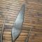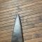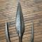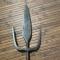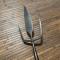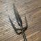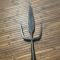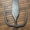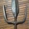 Fourche forgée à trois dents / piques deux latéral plus courtes de section carrées et la centrale à lame droite à double tranchant, arrête médiane sur une face.