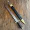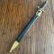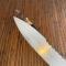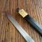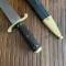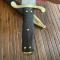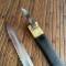 La poignée est munie de deux plaquettes quadrillé maintenues à la soie par cinq rivets en laiton. Particularité la garde en forme de S, ainsi que le pommeau arrondie sont en laiton.