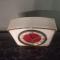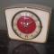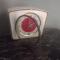 jonc plastique et lunette métal « or », cadran rouge , chiffres romains en relief sur zone ivoire , aiguilles métal « or » , vitre en verre bombé .