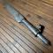 Poignard KARD entièrement en Damas , manche et base de la lamé damasquiné d'argent MOTIFS FLORAUX, FEUILLAGES ET VOLUPTE , DOS DE LA LAME ET POMMEAU ÉGALEMENT DÉCORÉ. SYSTÈME D'OUVERTURE VIA UN BOUTON PRESSION QUI LIBÈRE UN POIGNARD TRANCHANT LOGÉ DANS LE MANCHE, ÉGALEMENT ENTIÈREMENT EN DAMAS MÀCHE DÉCORÉ À L'ARGENT.