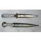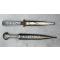 Le romantisme apparut en France sous la Restauration pour s'étendre jusque sous la Monarchie de Juillet. Courant prédominant de la vie artistique et littéraire durant la fin des 18e et 19e siècles est différent selon les pays, mais il possède partout un certain nombre de traits communs : rejets de l'imitation des Anciens et des règles du classicisme, naissance d'un nouveau mode de sensibilité, expression individualiste allant jusqu'à l'épanchement sentimental. Le romantisme, tout au moins dans sa phase première, se caractérise par une subjectivité passionnée qui conduit l'artiste à donner libre cours à la communication de ses sentiments, tendant ainsi à diviniser la nature, à opérer un retour aux sources légendaires, au folklore, au goût profond de tous les dépaysements, aussi bien dans le temps (redécouverte du moyen-âge) que dans l'espace (exotisme, engouement pour l'Orient, attachement à la Grèce moderne, etc). Oeuvres énigmatiques d'artistes anonymes, on ne peut aborder le domaine des dagues romantiques en parlant de généralités, simplement parce que ces armes ne tiennent compte d'aucune règle quant à leur réalisation ou à leur forme...