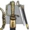 Superbe et grand sabre ou dague de vénerie, datant du 18ième siècles. La poignée est en bronze doré, on y retrouve : '' des incrustations de chasseurs, de chiens et de divers animaux de chasse ''. Elle est très solide, sans jeu, avec une garde en forme de coquillage, dans un état de conservation remarquable. La lame est gravée de '' différents décors floraux et reliefs '' en bon état avec des traces normales dûes au temps. Le fourreau est composé de bronze doré, de bois et de cuire, en bon état de conservation lui-aussi. Le sabre rentre parfaitement dans son fourreau. L'objet a été très bien entretenu pour arriver à nos jours dans un état plus qu'exceptionnel. L'objet est totalement original et très, très rare, quasi introuvable sur le marché, surtout dans cet état de conservation, '' de musée " ! ! ! Très agréable à tenir en mais et encore plus à observer en vitrine ! ! !