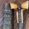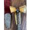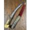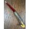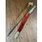 de la lame épouse une forme concave, deux discrets décors en Koftgari de fil d'argent se trouvent de part et d'autre de la lame en avant du point d'équilibre de l'arme : Etoile à 6 branches dans son cercle et cartouche sous forme de frise texte en Arabe en argent et Poinçon en creux de l'artisant forgeron. Fusée traditionnelle habillée de larges plaquettes en ivoire fossile rivetés. La tranche de la soie est habillée d'une feuille d'argent travaillée au repoussé avec incrustations de corail, pierres semi-précieuses et petits lingots d'argent le tout cercle de cuivre rouge. La mitre de garde et également en feuille d'argent repoussée et incrustée de corail elle court sur le départ de la lame formant un ricasso. Dans son fourreau à âme bois habillé de velours sang de boeuf avec chape et bouterolle en feuille d'argent à décor repoussé en suite avec les garnitures de la poignée.