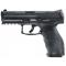 Le pistolet airsolf à ressort HK VP9 est fabriqué avec une carcasse en polymère et une culasse en métal. Il est équipé d'une sécurité manuelle, d'un rail sous le canon pour le montage d'une lampe ou d'un laser et d'organes de visées fixes.