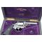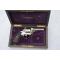 Finition poli blanc patiné avec superficielles traces d'oxydation, reste de coloration jaune paille sur chien détente et axe, monogramme MP gravé main sur le pontet. Plaquettes en ébène quadrillées sans accident. Canon long 80mm, profondes rayures non usagées d'aspect brillantes sans oxydation. Coffret noyer monogrammé MP sur le médaillon, petit manque de marqueterie sur la partie inférieur, intérieur velours violet bien marqué à l'or Fauré Le Page à Paris, compartiments à couvercles les munitions et les accessoires non disponibles, clef de serrure présente. Bel ensemble en très bel état de conservation, arme de grande qualité d'exécution qui mérite de trouver une place dans une collection d'armes anciennes françaises. Dimmenssions: Revolver 20cm Coffret 23 / 14cm