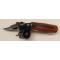 La belle crosse en bois Goncalo Alvès, est un peu courte et ne descend pas assez, à mon avis, sur le pontet, ( j'ai des doigts longs qui nécessitent une poignée conséquente en épaisseur et descendant bien sur le pontet, au risque de se faire punir par le recul au niveau du majeur). C'est pourquoi je privilégie la crosse en néoprène Pachmayr, compacte et épaisse, et descendant plus bas sur le pontet; par ailleurs sa matière amortit le recul et rend le tir de cartouches musclées plus agréable.