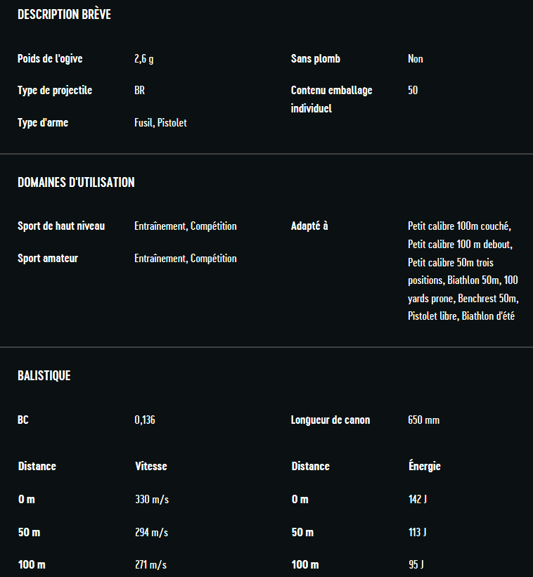 Avec son ogive BR de 2,6 g (40 grains) et une vitesse initiale de 330 m/s, la R50 garantit une régularité de tir incomparable, soutenue par un coefficient balistique élevé (BC 0,136).