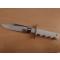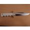 Model 16 SP1 Fighter. Top cutting edge sharpened approximately 3". 4.5" White Micarta finger grip handle (Clinton Exclusive). Extra heavy 0.875" wide tang extends through a channel in the handle, which is firmly fastened with epoxy. Nickel double hilt. 7" Stainless Steel blade.