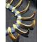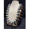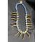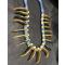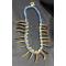 Magnifique collier composé de 19 griffes de grizzly réalisées en corne et os montées sur un lacet en peau de cerf et espacées par des grosses perles bleues d époque. A l époque les indiens utilisaient déjà des fausses griffes en cornes bois même bois de cerf sculpté.chaque griffe mesure 10cm de long .