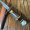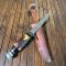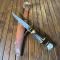 Manche en bois de Cerf naturel, pommeau aluminium, lame gravée HOLLOW GROUND, poinçon et gravure de la marque.