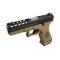 Pistolet Blowback Culasse métal noire Frame Polymère Tan Design Hexagonal Magwell Silver Canon externe silver Canon externe fileté pour installer un tracer ou un silencieux Culasse allégé améliorant le cycle Energie: 0.95 joules Capacité:27 billes Canon interne: 93 mm Longueur: Totale 200 mm Hauteur: 134 mm Mires en fibre optique