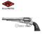 Ce modèle à simple action, avec une capacité de six coups, se distingue par sa finition en laiton nickelé qui offre un éclat brillant et résistant à la corrosion, tandis que les gravures ajoutent une touche d'élégance artistique.