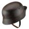 Du plus bel effet. Coque du casque en métal (peinture verte usée), sous casque en cuir (réglable par lanière), jugulaire en cuir ajustable, fermée par une boucle en métal.