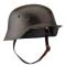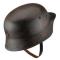 Du plus bel effet. Coque du casque en métal (peinture verte usée), sous casque en cuir (réglable par lanière), jugulaire en cuire ajustable, fermée par une boucle en métal.