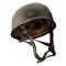 Du plus bel effet. Coque du casque en métal (peinture verte usée), sous casque en cuir (réglable), jugulaire en cuire ajustable ¨