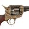 Superbe réplique du légendaire Colt Peacemaker 1873, calibre .45. Modèle Denix en métal avec finitions bronze vieilli et gravures décoratives sur le canon et le barillet. Crosse en bois véritable pour un rendu authentique.
