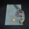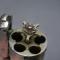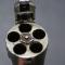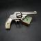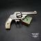Ce revolver Smith & Wesson Hammerless, dans sa version nickelée, est dans un état d’origine intact. Le nickelage recouvre l’ensemble de la surface, à l’exception de quelques manques mineurs en bout de canon et sur les arêtes du barillet. Le marquage du canon reste bien visible, bien qu’il présente une légère usure. Le numéro de série 45XXX indique une fabrication précoce. Ce numéro est également présent sous la crosse, sur le barillet et sur le système de verrouillage du barillet.