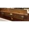 Coffret de belle facture avec coins laiton, anse sur le couvercle, 2 systèmes apparents de fermeture, petite poignée d’aide à l’ouverture.