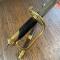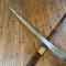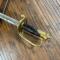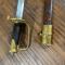 Monture bronze , garde ciselé ajouré, poignée cuir (sec usure) belle lame propre , fourrure bois recouvert de peau cousu à trois garnitures laiton et deux anneaux de suspentes. Pas de jeu.