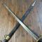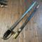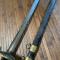 Lame à un pan creux et simple tranchant, bon état quelques traces de graisse séchée . Fourreau en cuir à trois garnitures en laiton et deux anneaux de bélière, couture ouverte, usures .