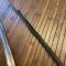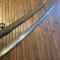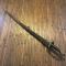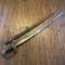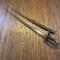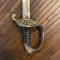 Lame à un pan creux. Fourreau en cuir couture ouverte à trois garnitures dont deux en laiton et deux anneaux de bélière. Bouterolle en fer usure.
