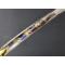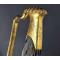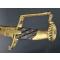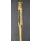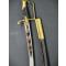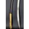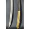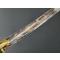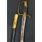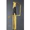 Sabre d'officier d'Infanterie époque premier Empire, Monture en laiton doré, garde monobranche droite avec une réparation d'époque sur le retour qui rejoint la calotte dite à côte de melon à courte jupe décorée de perles, oreillons en navettes, quillon recourbé, fusée d'ébène quadrillée en losanges (une fêlure). Lame bleuie et dorée gravées de trophées. Fourreau cuir à deux garnitures de laiton doré rappelant celles de la Garde Impériale, chape à bouton de suspente au baudrier, cuir très sain.