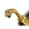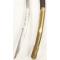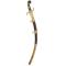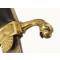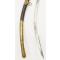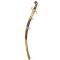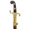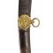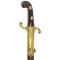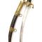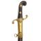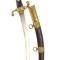 Sabre d'officier de cavalerie à la mode des Mamelouks époque premier Empire. Monture de laiton à croisière rectangulaire ciselée de pétales sur fonds perlés, deux quillons inversés à tète d'animal fantastique, demi oreillon gravé de toile d'araignée, fusée à deux plaquettes de corne noir maintenues par des rivets caché par des demi olives, fêles sur chaque face. Lame fortement courbée à l'orientale, longue de 76cm de section plate à contre tranchant vers la pointe. Fourreau bois recouvert de cuir cousu sur le bord, quatre garnitures de laiton à décors légèrement repoussés et gravés de toile d'araignées, fleurs et trousseaux de flèches, deux bracelets de bélière bombés maintenus par des bourrelets de cuir, tête de lion ciselées en relief en face avant et au revers des fleurs de pivoines sur fonds perlés.