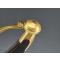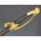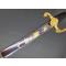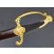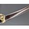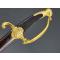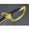 Sabre d'officier de cavalerie légère ou d'état major époque premier Empire, lame courbe à dos et pan creux de 825mm, finition d'origine bleui doré sur gravures d'attributs militaires au premier tiers puis polie brillant avec fines taches non corrosive. Superbe monture en laiton doré, garde mono branche arquée et allégée par des gorges et terminé par un quillon enroulé en suite de la fixation de la branche de garde au pommeau à dôme et courte jupe, croisière rectangulaire à fond perlé à deux oreillons en forme de coquille Saint Jacques, fusée en ébène quadrillée (petits éclats en bordure sans fissure), aucun jeu. Fourreau fer à deux larges bracelets en laiton doré patiné, fines traces d'oxydation, dard en forme de lyre.