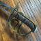 Fusée bois recouverte de basagne cuir de veau et filigrane laiton (accident au cuir et au filigrane), pommeau en forme de bonnet phrygien, garde laiton enveloppante multi branche de fixation on sauter ça se rattrape facilement , cravate en tissu , lame à la Montmorency forgée à SOLINGEN, légèrement courbe à gorge centrale, fil tranchant non accidenté, lame gravée à l'or sur ses deux faces avec reste d'or et de bleu : Trophée d'armes militaires, chapeau, feuillages, voluptes, et gravée VIVRE OU MOURIR. Oxydation