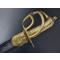 Monture en laiton, poignée à 20 torons, garde en plateau palmé de cinq lobes et trois branches de protection montées à queues d'arondes ce qui atteste l'authenticité du modèle conçu ainsi. Poinçons R à la grosse couronne sur l'arrière du plateau et le talon de la lame.