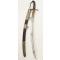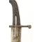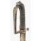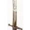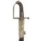 Monture à la hongroise en laiton argenté, garde monobranche décorée en relief, croisière à fort oreillons en baguette à arrête centrale décoré aux traits, un losange sculpté au centre, terminé par un quillon enroulé ciselé en relief de rocailles en suite de la branche. Fusée bois ficelée recouverte de chagrin filigrané d'argent torsadé, calotte à longue queue de type montmorency. Lame de 67cm courbe à dos gorges et gouttière gravée sur chaque face, au talon d'arabesques avec en son centre un médaillon de portraits entouré d'attributs militaires sur fonds dorés puis de hussards chargeant sur un piédestal, aucune oxydation ni d'ébréchures. Fourreau bois recouvert du même chagrin à trois garnitures de laiton argenté à décors repoussé de rocailles, traces de coups d'éperons sur la bouterolle avec une fine trace de brasure. Longueur totale 82cm.