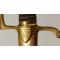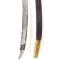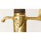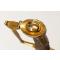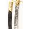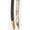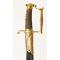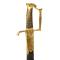Sabre de Récompense du Directoire, dit des Quatre cents braves, donné par le Ministre de la Guerre. Poignée recouverte de galuchat, avec filigrane. Monture en laiton doré à une branche moulurée. Calotte à courte queue (7,4cm) avec une petite craquelure, à tête plate concave surmontée d'une olive à pans où s'articule un demi-anneau de dragonne dont une partie manque. Garde à une branche à pans et quillon courbe à bouton à facettes. Fusée en bois recouvert de peau de roussette filigrané d'un double fil tressé en cuivre argenté. Hauteur totale de la garde 16,2 cm, largeur 13,5 cm, épaisseur au niveau de la calotte 3,2 cm. Oreillons en forme d'écussons (hauteur 3,5 cm, largeur 3,2 cm), gravé sur une face « Le Ministre de la Guerre à la 3è Comp-e de la 19è 1/2 Brig-e » et sur l'autre face « Manufacture à Versailles » et poinçons « LD » probablement celui de Lamogère Directeur, « AB » et « Boutet » typique des armes de récompense et d'honneur. Lame courbe, à dos plat gravée « Klingenthal », contre-tranchant et pans creux, gravée d'arabesques de végétaux et d'attributs militaire sur fond dorée et bleuie au tiers avec traces d'oxydation, longueur 65cm ; largeur au talon 3,7cm, épaisseur au talon 9,4cm, flèche de 2,2cm. Fourreau en cuir noircit bien d'époque à deux garniture en laiton découpes festonnées avec reste de dorure, usure et rétrécissement du cuir par l'humidité, chape à cuvette et bouton en forme d'écu (hauteur 11.1 cm, largeur 4,4 cm, épaisseur 1,6 cm, épaisseur au niveau du bouton 2,5 cm) petit trou circulaire sur la face arrière, bouterolle en suite (hauteur 12.3cm, largeur 3,6 cm, épaisseur 1,2 cm, épaisseur au niveau du dard 1,3 cm). Longueur totale 79cm