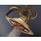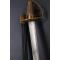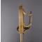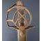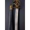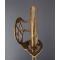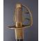 Peu commun modèle de sabre à la Montmorency époque révolutionnaire aux deux fusils à silex entrecroisés attribué aux fusiliers d'infanterie. Monture de laiton patinée, plateau découpé, médaillon central ajouré de deux fusils posé sur le plateau et maintenu par deux branches secondaires., calotte à queue et dôme de rivure, fusée recouverte de filigrane de cuivre torsadé et virolée à sa base. Lame de 70cm légèrement courbée à gorges et gouttières dans sa finition d'origine polie blanche finement tachées. Fourreau de cuir actuel de belle facture à deux garnitures d'époque en laiton patiné. Longueur totale 83cm