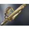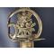 Pommeau casque à l'antique, garde à trois branches sur plateau découpé, décor au chien, grenades, canons, armure et drapeaux, fusée bois entièrement filigranée de cuivre fin torsadé, virole laiton à la base, petit décrochement du fil près du pommeau au casque empanaché.