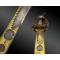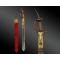 Lame en acier, en damas, à un tranchant et contre tranchant fixée de part et d'autre par deux attaches de renfort découpées et ajourées recouverts de damasquine d’or.