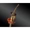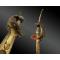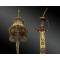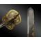 La poignée en acier, présente une fusée bardée de tissu et une garde en coquille, cette dernière est recouverte de son velours d’origine ; sur le dessous sont présents deux renforts de lame qui comprennent deux quillons ciselés et percés. Le pommeau en cuvette est surmonté d’une demi sphère et d’un long bouton de rivure. L’ensemble est recouvert de damasquine d’or.