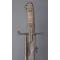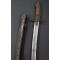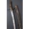 Monture de laiton à une branche de garde sectionné lors de sa chute de cheval, longue calotte à tête de lion, longs oreillons en navettes, quillon à bouton, poignée bois recouvert de tissu entièrement filigrané surlié de fil de cuivre torsadé. Lame courbe robuste et souple en damas à fort contre tranchant et pointe en langue de carpe gravée au talon dans des cartouches surmontés d'étendards d'un personnage à la turc, de symboles cabalistiques, d'une lune et d'attributs militaires sur le dos plat, gravées à l'acides des inscriptions commémorant ses prodiges de valeurs " LA SECTION DE 1792 AU BRAVE DUPLESIS " d'un côté puis " SEUL IL A VAINCU DIX HUSSARDS ET A PREFERE LA MORT PLUTOT QUE DE NE PAS CRIER VIVE LA NATION "belle finition en damas en forme de triangles longitudinaux, fines traces d'oxydation due au dur combat et au rangement de la lame sans l'avoir au préalable nettoyée, longueur 820mm à fort contre tranchant de 240mm, talon de 35mm. Fourreau dans sa patine également sans avoir connu un nettoyage depuis, en bois recouvert de chagrin patiné et craquelé, deux longues garnitures et deux alèses de laiton. Arme parfaitement homogène et authentique sortie d'une maison Normande en 2019 le sabre n'a jamais été nettoyé depuis 220ans, il a certainement été ramener en France à l'époque pour être gravé et rendu par honneur vers sa famille.