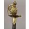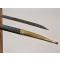Sabre du Régiment Royal-Carabiniers modèle de 1740 en usage jusqu'à 1754-55. Forte monture de laiton décor à coquille originaire de l'Europe du Nord, le désir de singularisme des Carabiniers régiment d'élite dont le roi est le capitaine amène à l'adoption du sabre à coquille, quillon courbé en forme de goutte, courte ovoïde décoré aux traits évoquant une coquille Saint Jacques, poignée de bois gainée de filigrane de laiton torsadé et renforcée de viroles de laiton. Lame fine et légèrement courbée de 854mm à dos et gouttières signée Abraham de la marque aux raisins à Solingen au talon, fleur de lys gravée parmi d'autres inscription illisibles, patine grise avec traces d' oxydation. Fourreau postérieur de cuir fort à garnitures laiton: chape à bouton et bout à dard en fer. Rare arme en excellent état de conservation général.