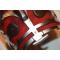 Forte épée avec magnifique garde enveloppante et caractéristique de ce type de monture. Poinçon relevé " q " . La fusée est recouverte de cuir noir. La garde enveloppante possède une forte pièce de toile rouge (postérieure).