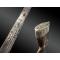 Lame légèrement courbe, à un tranchant et trois gorges sur chacun des côtés. Nombreux poinçons en forme de croix, de croissant de lune et de l’ordre de SANTIAGO (Saint Jacques de COMPOSTELLE)Poignée en corne, recouverte à ses extrémités de garnitures en argent gravé.