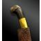 Lame en acier à un tranchant, dos épais et pointe droite, légèrement biseautée, fusée au pommeau en corne brune formant une tête aviaire stylisée et haute virole en laiton doré à sept pans.