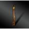 Fourreau constitué d’une lame de bois garnie de trois larges bandes de cornes blondes rivetées de bandelettes de laiton doré. La chappe est en cuir brun à décor géométrique incisé, la bouterolle en laiton doré rivetée à cinq reprises.
