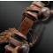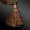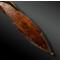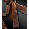 Fourreau en cuir dont la partie distale est en forme langue de carpe, gravé de motifs géométriques, pends de loque frangée décorés en suite, renfort en laiton découpé.
