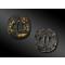 Tsuba Shi No Maru Gata en fer ciselé de deux personnages aux visages de cuivre et d’argent, arborant des kimonos à décor géométriques dorés, le tout rehaussé d’or, d’argent et de cuivre.