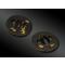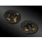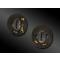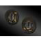 Tsuba Naga Maru Gata en cuivre recouvert de pigments noir, décoré de cinq shishi dorés.