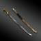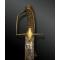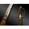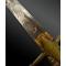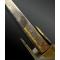 Lame à un tranchant et un contre-tranchant, à pans creux, gravée au premier tiers de faisceaux d’armes, de rinceaux, de fleurs, d’un chasseur, le tout rehaussé à l’or ; dos plat ciselé d’un soleil et d’une étoile rehaussés d’or.