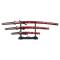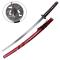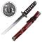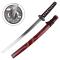 Ensemble de 3 pièces composé d'un katana, un wakizashi et un tanto avec motif dragon sur fond rouge.